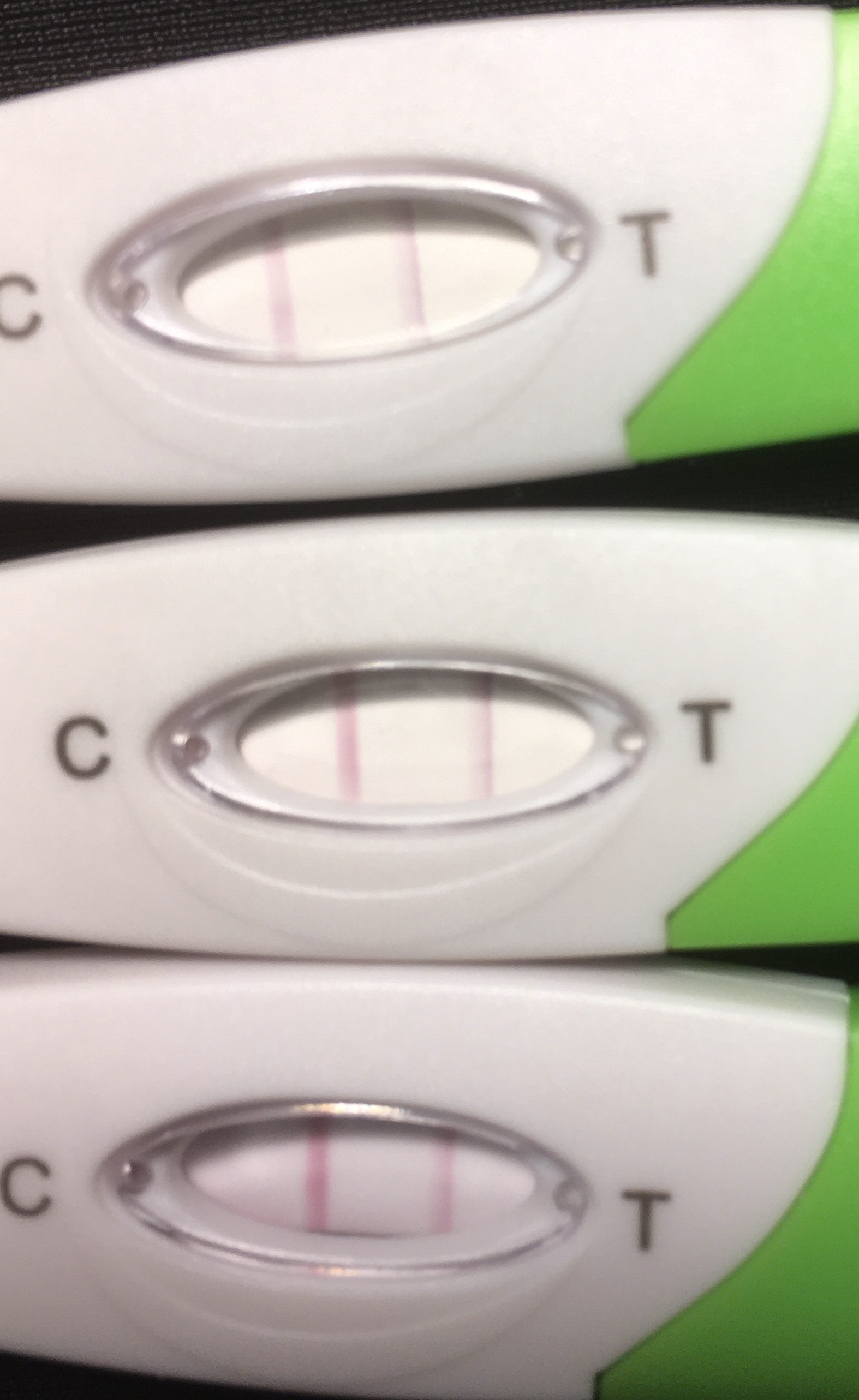 Tein toissapäivänä, eilen ja tänään apteekin ovulaatiotestin. Kahdessa ensimmäisessä (kuvassa ylimmät) olivat testiviivat todella tummat mutta ohuemmat kuin kontrolliviiva. Tänään testiviiva on selvästi haaleampi kuin kontrolli. Saattoivatko kaksi ensimmäistä olla positiivisia?