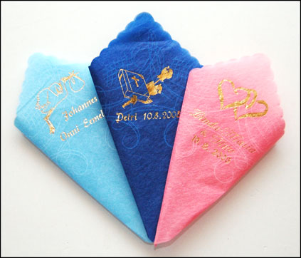 muistan olleeni joskus häissä missä oli servetit joissa oli painetut nimet ja joku kuva. mutta tästä on jo aikaa...