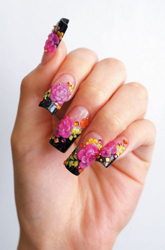 Glitterit ja jotkin kauniit kukat koristeena vielä ymmärrän, tosin ei nekään ole mun juttu, mutta nuohan on ihan överi-kynnet. Mitä noiden kanssa pystyy tekemään, nehän tarttuu joka paikkaan.