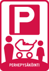 isä, äiti ja lastenvaunut. Jos lapsi ei ole vaunuissa, ei perheparkkiin ole asiaa, eikä äidillä ilman isää.