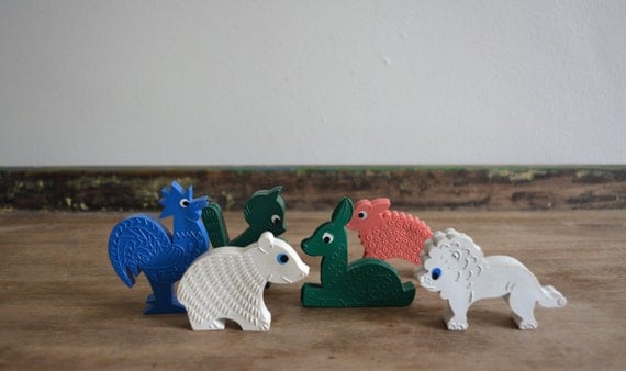 Ole hyvä! Nuo löysin hakusanalla "west germany rubber animal", mutta myös hakusanalla "rullaeläin" tulee suomalaisista blogeista hakutuloksia. En valitettavasti tiedä noiden "oikeaa" nimeä.