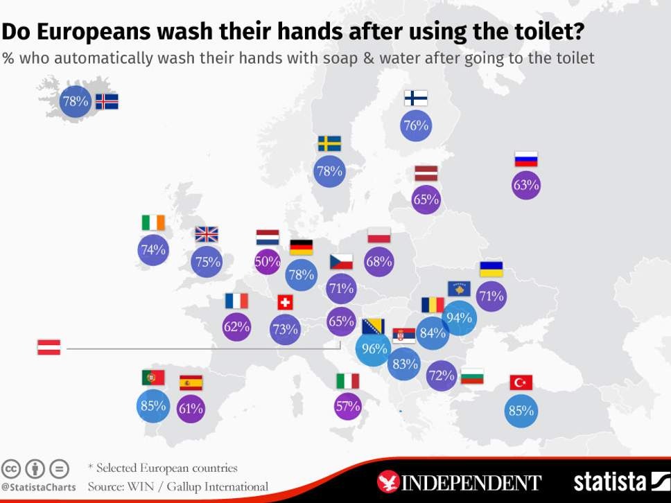 Euroopassa vähiten käsiä pestään Alankomaissa (50%) ja Italiassa (56%).
