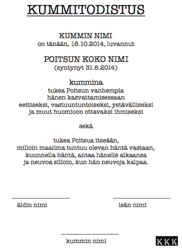 Sillä henkilökohtaistamisella tarkoitin sitä, että jos esimerkiksi tuleva kummi on hauska ihminen, niin tuohon esimerkkinä olevaan kummitodistukseen voi laittaa noiden muiden adjektiivien joukkoon sanan "huumorintajuiseksi". Eli siis miettii millainen ihminen tämä kummi on ja mitä toivoo että hän lapsellesi opettaa :)