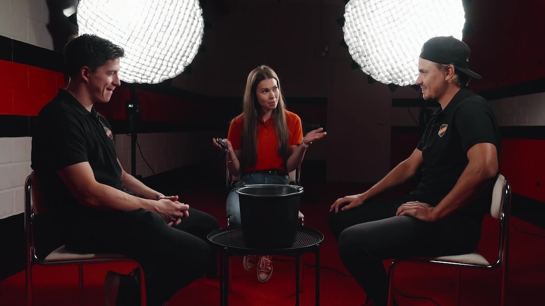 MTV3:n Hockey Night -ohjelmien haastattelustudio-osioissa Viivi Pumpanen haastattelee kiekkoilijoita kahden isokokoisen studiovalaisimen edessä: