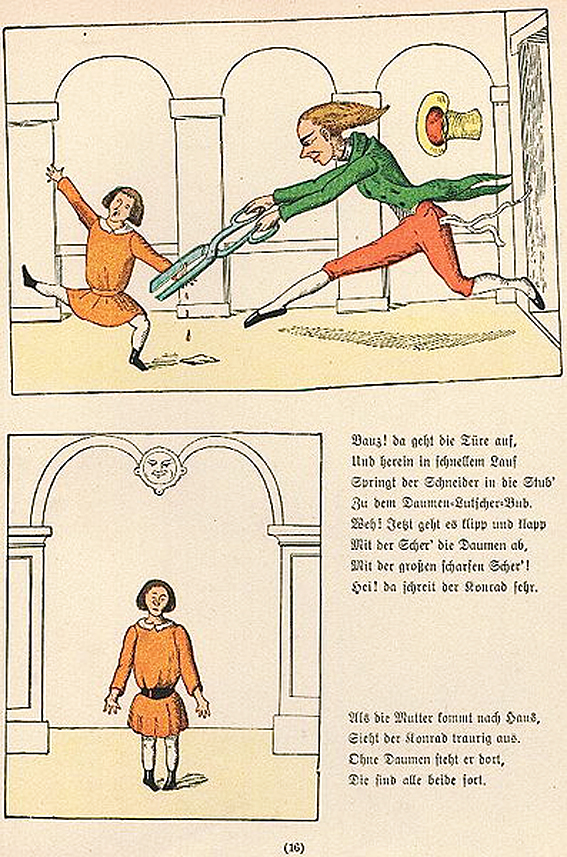 Tilasin muutama vuosi sitten Heinrich Hoffmannin satukirjan itselleni kotiin alkuperäiskielisenä. Lapsena siitä jäi traumat, mutta hauska näin aikuisena muistella ja ihmetellä niitä raakoja lastensatuja karmaisevine kuvituksineen. Jos olisi omia lapsia, en varmaan heille lukisi pikkulapsi-iässä. Voisin näyttää kuriositeettina sitten kun ovat teini-ikäisiä tms :)