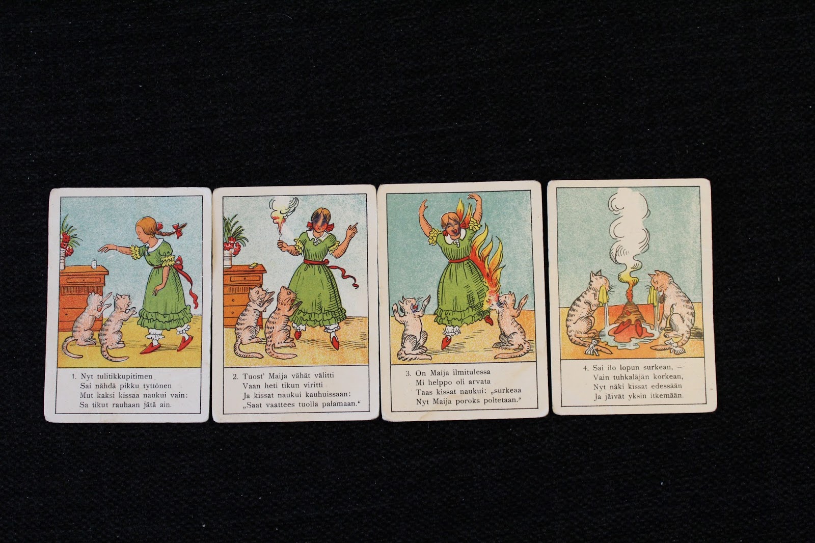 " Muista tätä seikkaakin, räätäl tulee leikkaakin, peukalos kuin paperin...tuskin äiti mennyt on, pisti suuhun peukalon. Hui! Jo ovi aukeaa, räätäl huippaa harppaa pojan luo, joll´on tuhma tapa tuo. Sakset sanoo niks ja naks, peukaloiset riks ja raks. Peukaloiset poissa on "voi" huus poika onneton...". Lisäksi oli tyttö joka leikki tulitikuilla ja poltti itsensä. Viimeisessä kuvassa kissat itkevät vuolaana kymenä. Ilmaan-katsoja Hannu, Vilho, joka ei syönyt velliään ja kuoli nälkään: haudalla oli itkevä koira ja tyhjä soppalautanen.