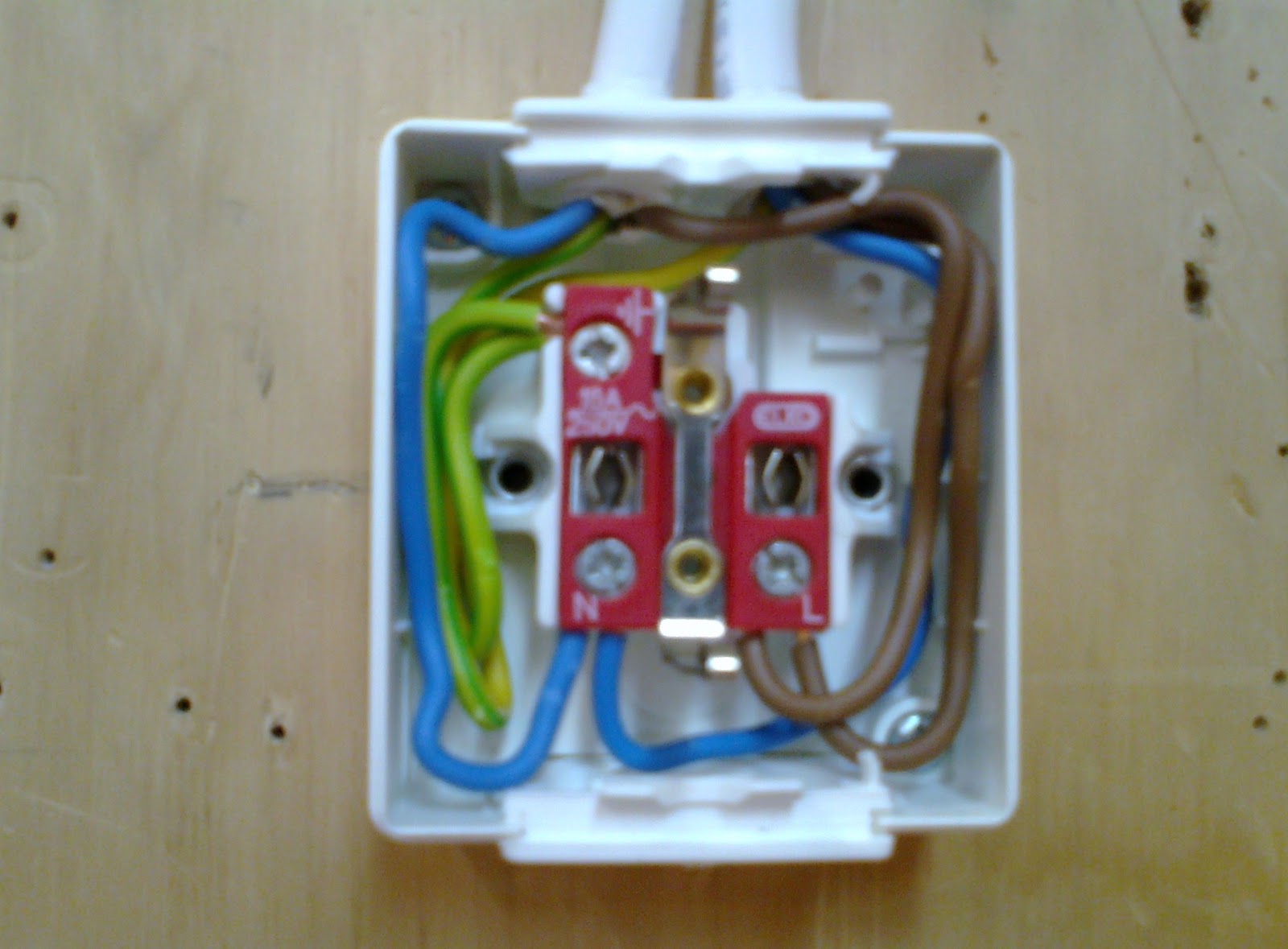 Töpselin jos laittaisi kiinni niin työnnät vaan piikit noihin punaisten osien keskellä olevien metallihakasten väliin ja katsot että maadoitusliuskat ottaa kiinni töpselin sivuille. Sähköiskun saisit koskemalla paljaisiin metalliosiin ruskeiden johtojen puolella, joten sinne ei kannata sormella kokeilla.