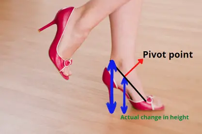 Tuo linkkaamasi kuva selittää idean, mutta kuvassa on virhe. Siinähän "pivot point" liikkuu sijaintiin, joka on paljon kengän korkoa korkeammalla, eli tuon kuvan mukaan ihminen liikkuisi korkokengillä siis korkeammalle, kuin koroilla on pituutta :D Hyvin kuitenkin käy idea selväksi, jos ei kiinnitä tuohon "pieneen pyöristykseen" virhettä.