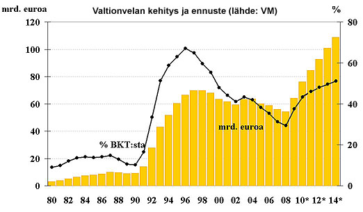 Suomessa on viimeisen 30 vuoden aikana ollut kolme puhdasta porvarihallitusta. Tämä nykyinen siis se kolmas. Valtion velka on kasvanut kaikkein jyrkimmin juuri näiden kahden edellisen porvarihallituksen aikana ja kasvanut myös tämän nykyisenkin aikana.
