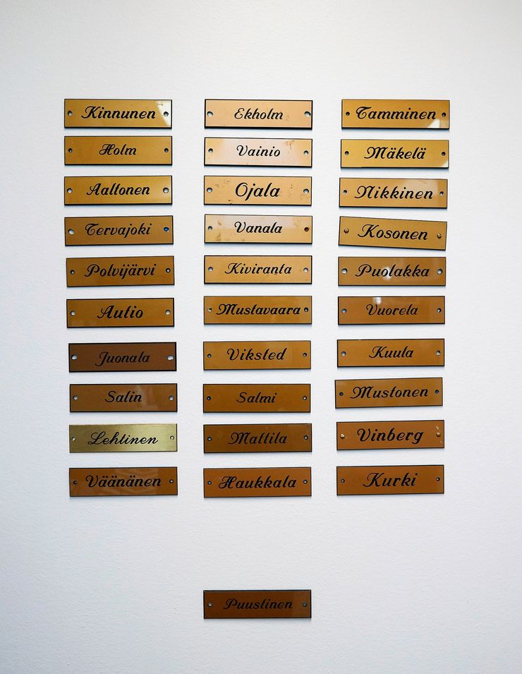 Tässä Apussa oli kuva näistä nimikylteistä. Koitin joskus selittää samaa, mutta onko noi Salmi, Kinnunen ja Lehtinen olleet jotakin täytenimiä? En ainakaan muista sen nimisiä hahmoja koskaan olleenkaan.