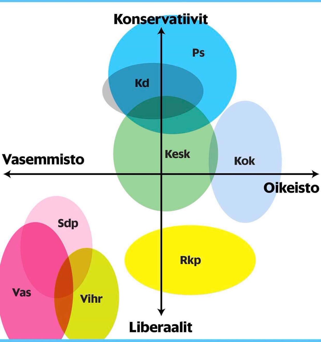 Keskusta on nykyisin jopa enemmän oikealla kuin kokoomus lukuisine apupuolueineen. Perussuomalaiset on konservatiivisena puolueena aikalailla keskellä ja siten on kaksi vasemmistopuoluetta. Miniminipuolueet on sitten kuka missäkin.