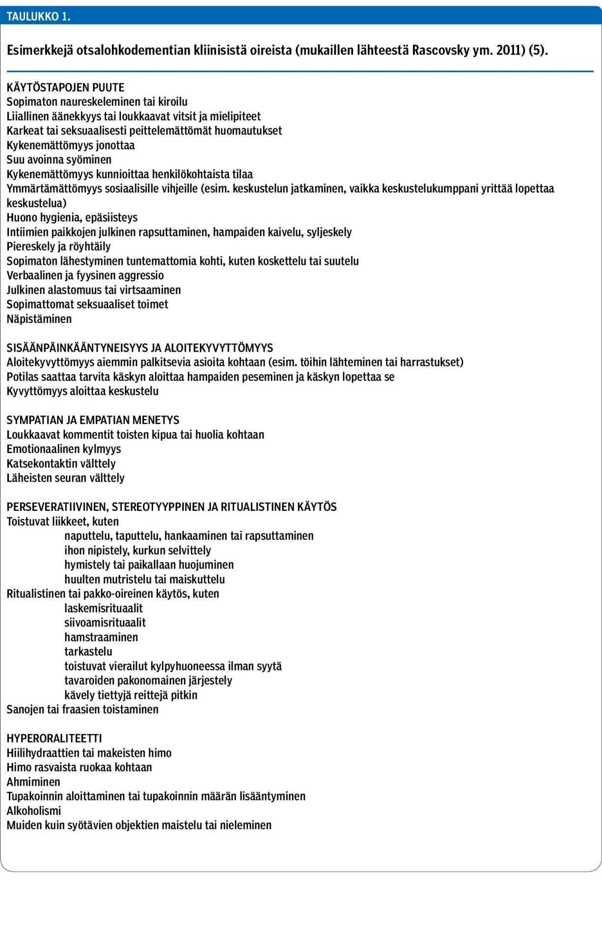 Otsalohkodementian ensioireita ovat muutokset käyttäytymisessä ja persoonallisuudessa (taulukko 1). Lisäksi arviointikyky ja toiminnanohjaus heikkenevät. Henkilö voi olla joko apaattinen tai toisaalta levoton ja vauhdikas, aivoatrofian sijainnin mukaan. Merkittävällä osalla potilaista tauti ilmenee alkuun mieliala- ja psykoosioirein (7), kun taas muistisairauteen viittaavat varsinaiset muistivaikeudet ovat vähäisiä. Tämän vuoksi taudin tunnistaminen on haasteellista, samoin kuin erotusdiagnostiikka psykiatrisiin sairauksiin nähden. Mielenkiintoisen havainnon mukaan jopa puolet otsalohkodementiapotilaista on tehnyt taudin alkuvaiheessa rikoksen (esim. liikennerikkeet, seksuaaliset hyökkäykset, omaisuuden tuhoaminen, väkivalta) (8).