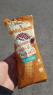 S-marketista löysin Kotimaista-merkin suklaakuorrutettu puolukka ja valkosuklaa-mustaherukka puikkojätskit. Raikkaita makuja ja vain 0,99 e.