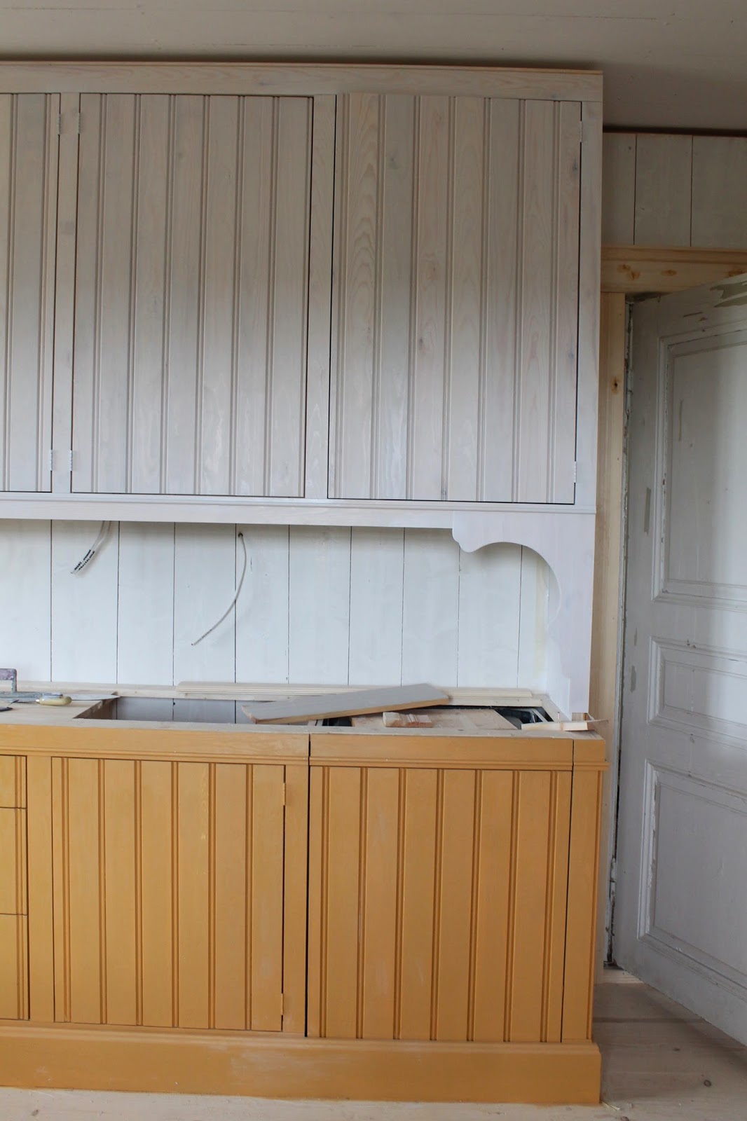 No meillä on vanha talo ja keittiössä matala huonekorkeus sekä kaikenlisäksi tummanruskea katto. Sinne jokatapauksessa laitoimme rintapaneelin ja se on ihana. Se maalattu paneeli kiertää huoneen niin että se on samalla välitilamateriaalina.