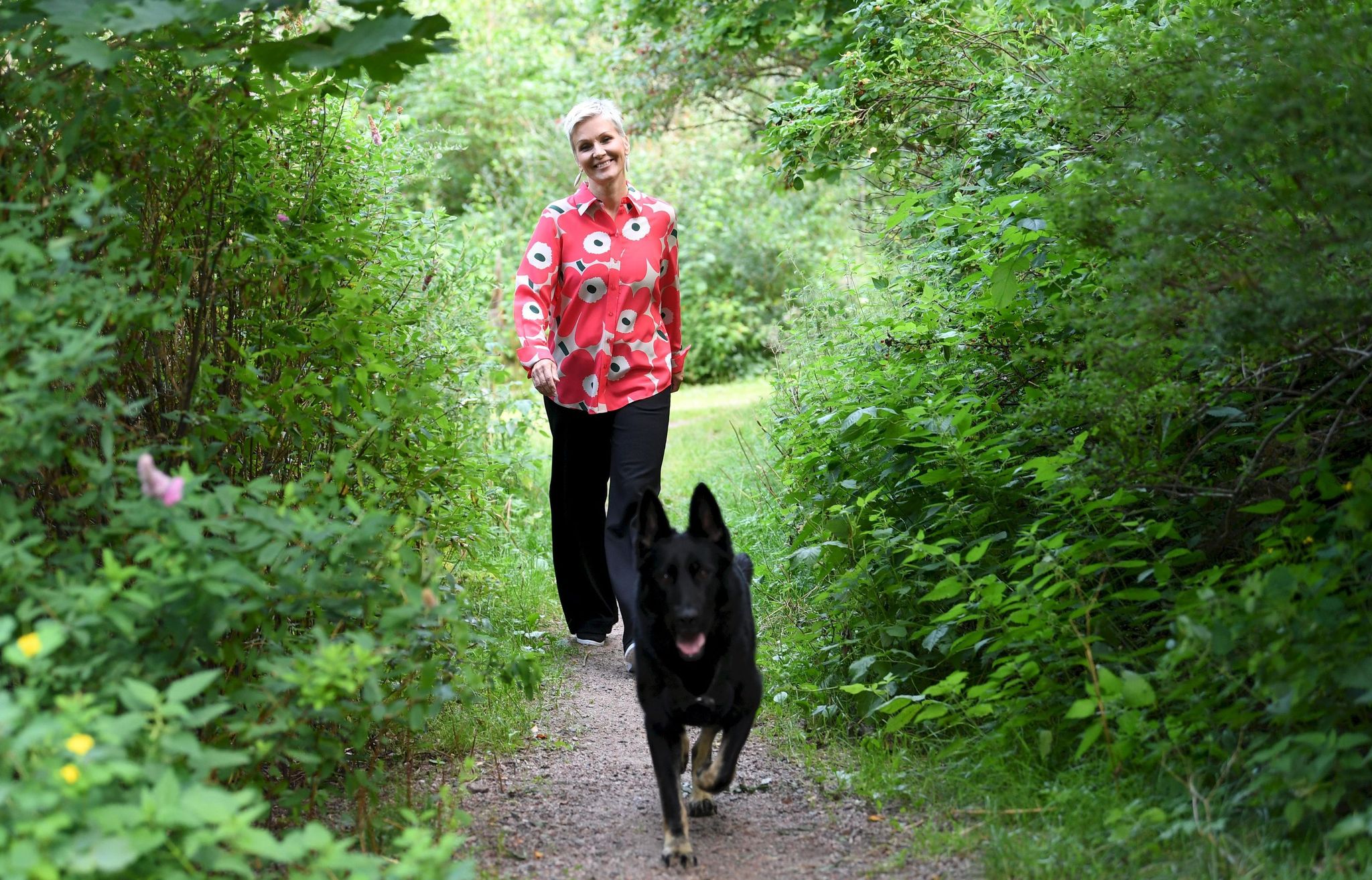 Näyttäköön vaikka 100-vuotiaalta, mutta kaunis hän on. Tuossa kuvasa, jossa kävelee koiran kanssa, ei näytä yhtään yli 50-vuotiaalta.