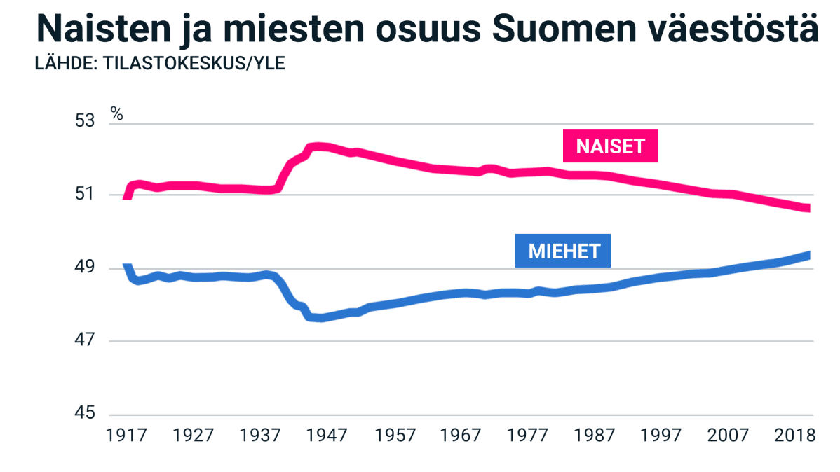 Ylen sivuilta.Suomessa on aina ollut naisia enemmän kuin miehiä. Vaikka poikia syntyy enemmän niin niitä myös kuolee enemmän.