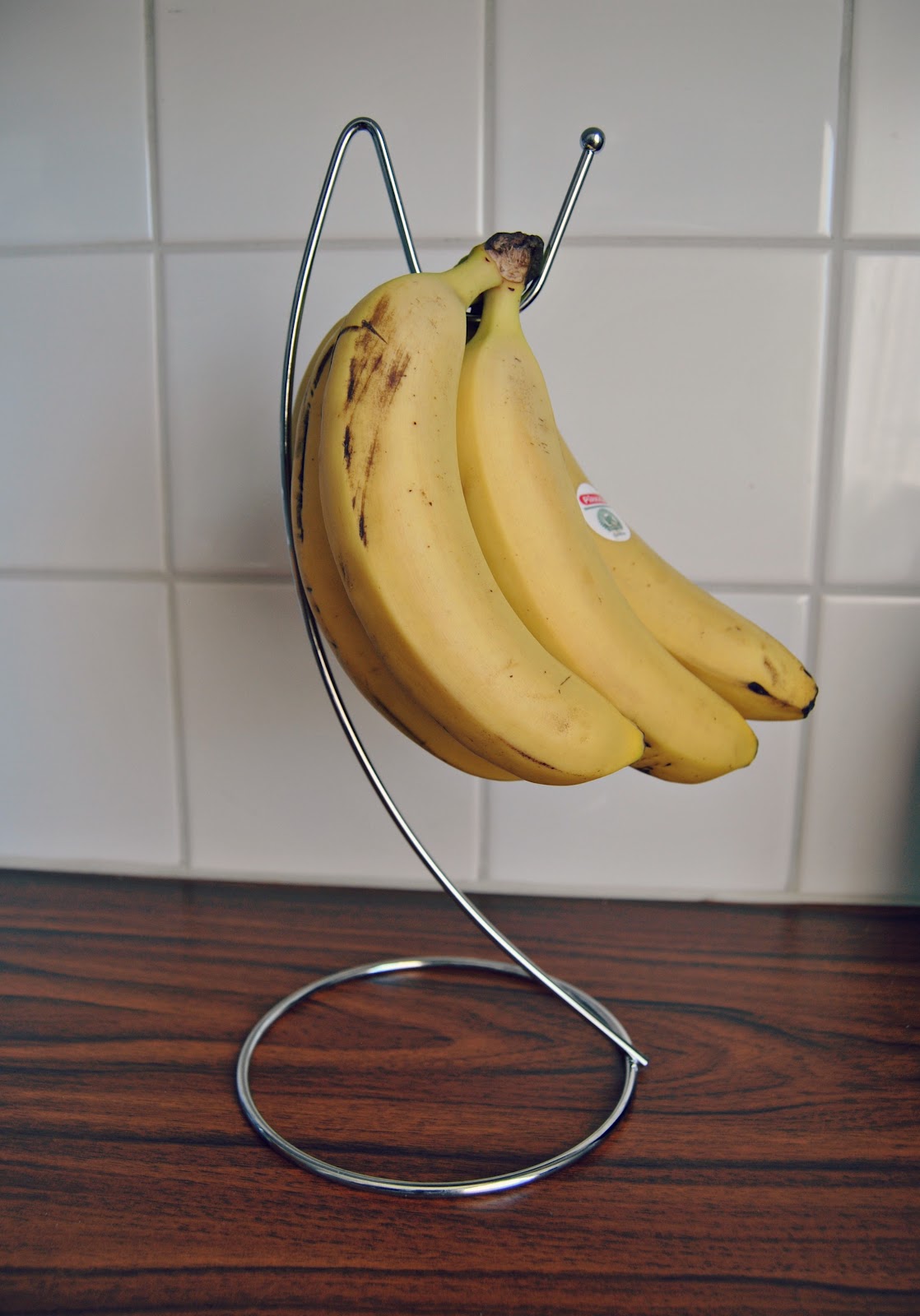 Suunnilleen tuollainen eli koukku banaaneita varten, mutta alaosa tasaine levy ja koko häkkyrä pyörii.