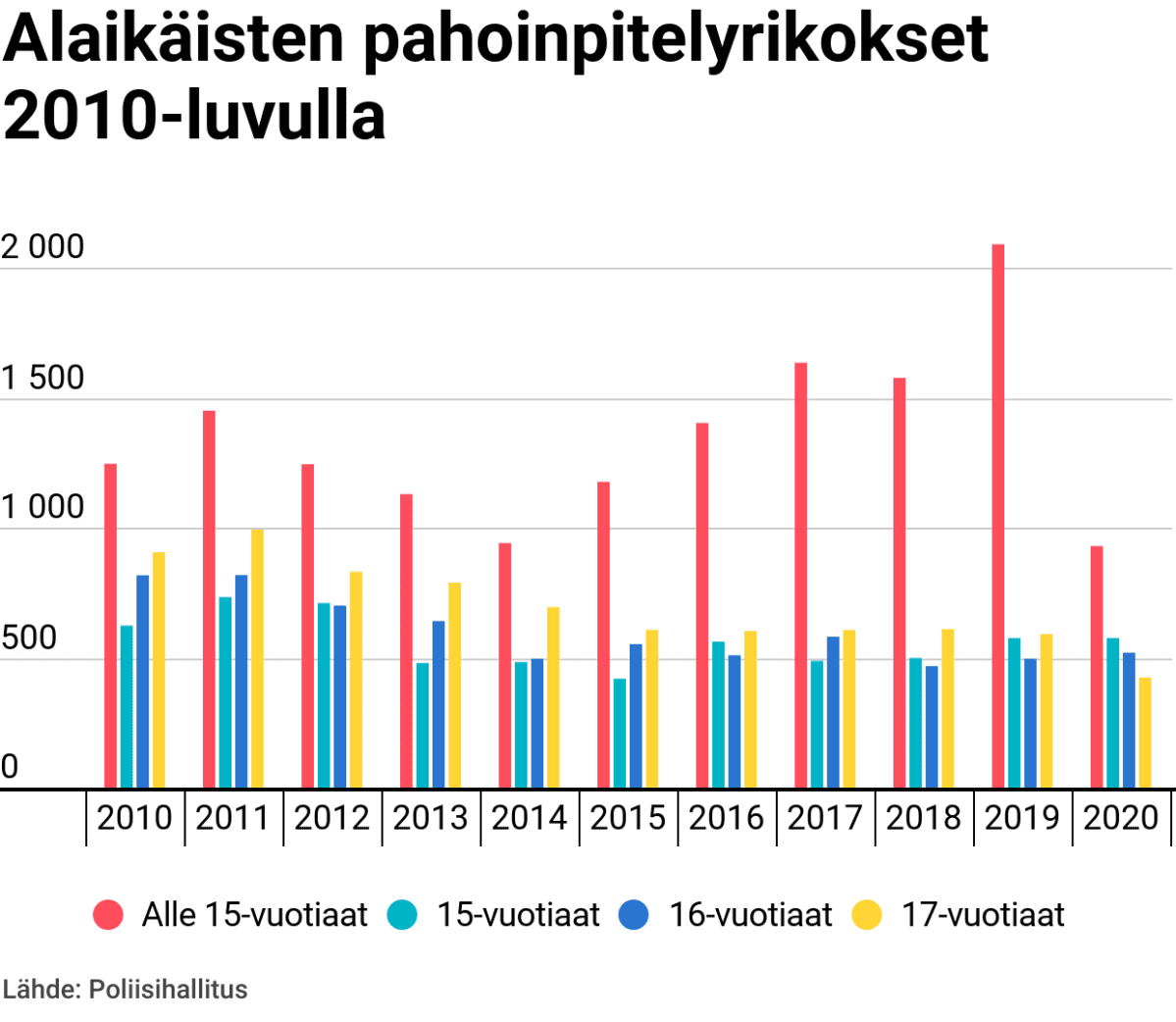 Alle 15-vuotiaiden tekemien pahoinpitelyiden määrä on lisääntynyt viime vuosina todella paljon. Mitähän tuossa vuonna 2015 oikein tapahtui, kun ne pahoinpitelyt alkoivat lisääntymään..?