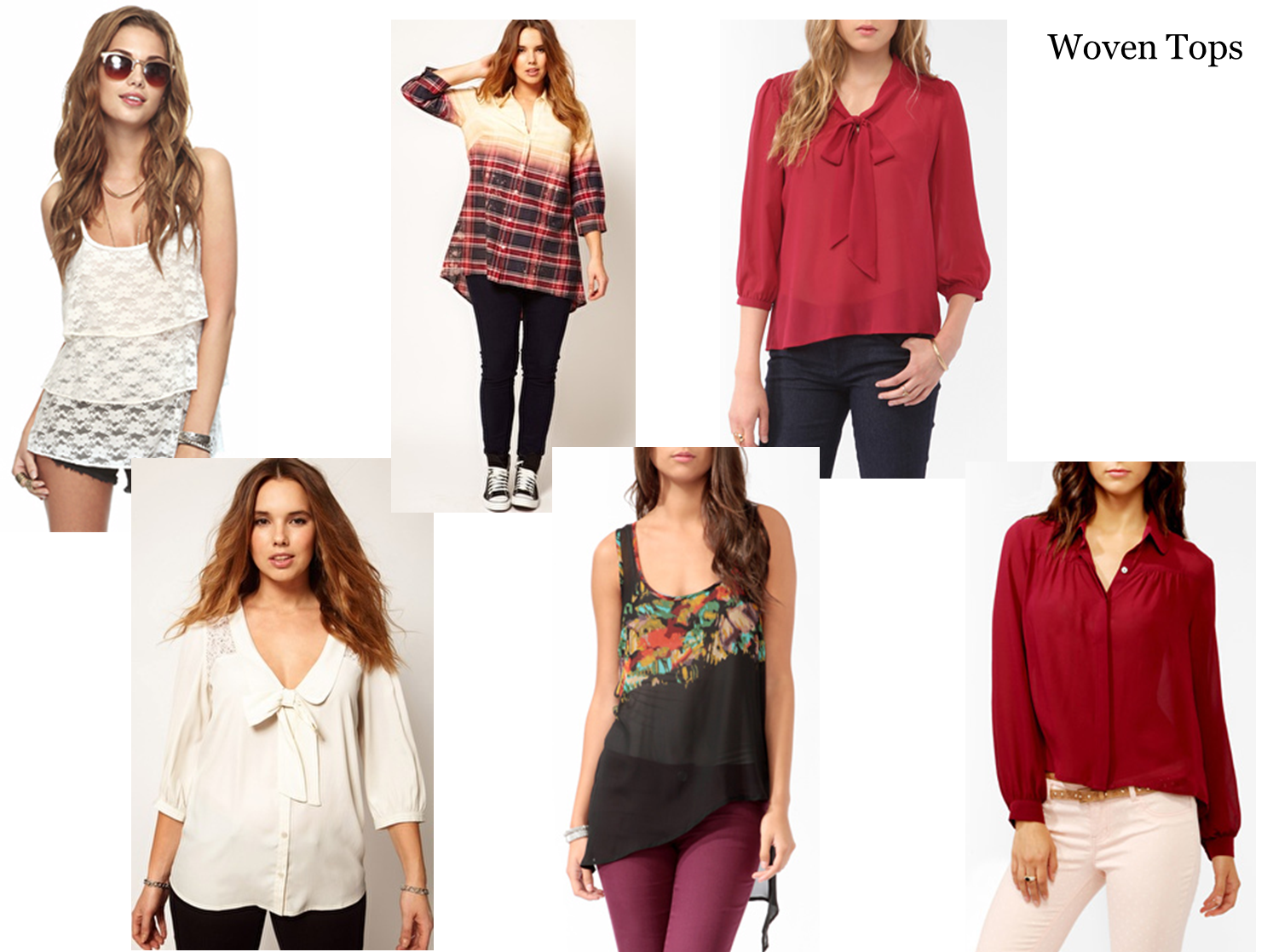 Kollaasin paidoista voisi joku sopiakin. Matalavyötäröiset farkut ovat kuitenkin nou-nou. Jää mahan läskit läiskymään. Korkeavyötäröiset farkut ja esim. kuvan ylärivin rusettikaulukselllinen paita olisi hyvä yhdistelmä. Vyötärö jää piiloon puseron helman alle. Mistäs noita paitoja saa?