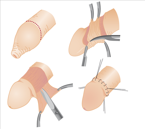 Mistäköhän toi ajatus tulee että naps vaan. Siinähän leikataan iso kaistale ympäri penistä pois!