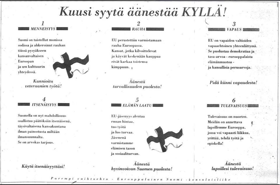 Äänestä lapsillesi tulevaisuus - kehotti puolestaan vaali-ilmoitus Kalevassa vaalipäivänä 6.10. 1994. EU-jäsenyys alentaa ruuan hintaa, tuo työtä ja luo turvaa, luvattiin. Lisäksi Suomen on mahdollisuus osallistua päätöksiin itsenäisenä, ilman painostusta miltään ilmansuunnalta, rummutti Eurooppalainen Suomi -kansanliikkeen mainos.