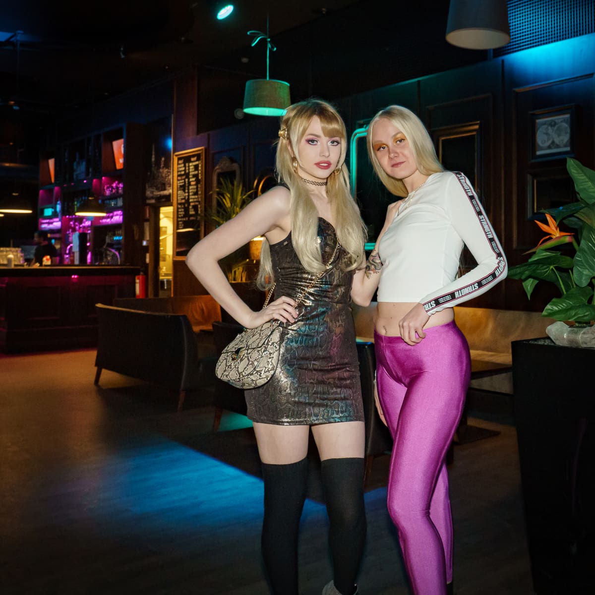 Toisella sellainen look ja toisella yökerhossa jumppahousut ja jumppapaita. Kirsikkana kakun päällä näkyy paljas mahapömppö.