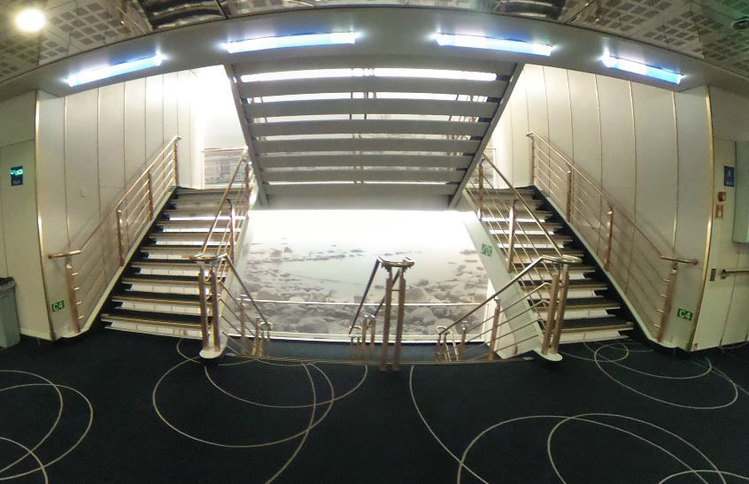 Tuo kaatunut portaikko ja siinä kulkeminen on tosi hankala käsittää. Voi vaikka tutkia tätä kuvaa, kääntää sen 90-astetta kuvaamaan kyljelleen kaatunutta laivaa ja alkaa miettiä miten siinä tulisi mennä. Eli pitäisi edetä ikäänkuin sivukaidetta kädellen siksakkia laivan pituussuunnassa ja sitten kyetä vetämään tai laskemaan itsensä ylemmälle tai alemmalle tasolle pystysuunnassa aina kun tulee vastaan tasanne. Lopulta ovikannelle päästyä pitäisi kyetä pääsemään sinne kannelle johtavalle ovelle PYSTYSUORAAN seinän viertä kulkien (ovi on ikäänkuin katossa), jolle on vieläpä matkaa joku 4-5 metriä ainakin...