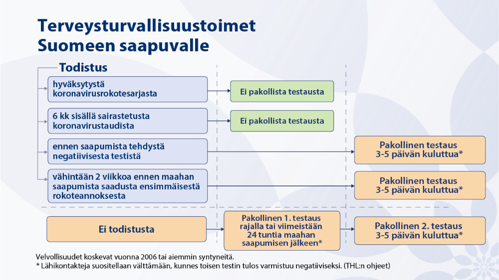 Kaikkien muiden henkilöiden tulee hakeutua testiin sekä maahan saavuttaessa, että 3-5 vuorokauden kuluessa maahan saapumisen jälkeen.