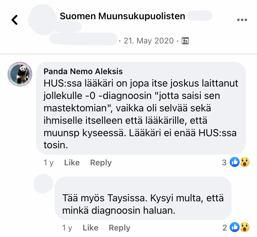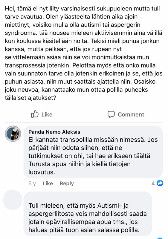 Yritän ymmärtää asiaa teidänkin näkökulmasta, jos siihen ei osaa samaistua niin vaikea sitä on ymmärtää. Mutta 25-30 v ikäraja on täysin kohtuuton. Harva ei oikeasti jaksa käydä tälläistä rumbaa läpi, ellei aidosti niin tunne. Lisänä pelko siitä, menettääkö perheensä, hyväksyy ketään, vastaako testo niin kuin toivon (esim. Geenien takia parta ei ehkä kasvakkaan testoista huolimatta vaikka niin olisi toivonut jne) ja väkivallan uhka. Itse olen tältä kaikelta suurimmaksi osaksi säästynyt, mutta silti. Prosessi on rankka, haastava ja menetyksen pelkoja on paljon.