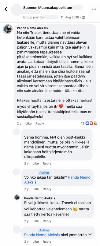 Olen tavannut itsekin joitakin ihmisiä, jotka ovat kyseenalaistaneet sukupuoli identiteettinsä, mutta siinä on ollut jokin haiskahdus. En voi silti sanoa, että jokainen trans etenisi saman kaavan mukaan, mutta hoitajat yleisesti kyllä aistivat tälläiset herkästi. Mikään hoito ei silti ole riskitön. Mutta kuten sanottu, Miran kaltaisia on, mutta enemmistö kokee aidosti sen mitä itse koen ja homma menee nappiin. En usko, että olisin elossa tai ainakaan toimiva yhteiskunnan jäsen jos tämä olisi liiaksi pitkittynyt. Ja kyllä kävin terapiassa ennen ja jälkeen testohoitojen. Nykyään en käy transasioista vaan aika perusluontoisista asioista millä ei ole transsukupuolisuuden kanssa mitään tekemistä.