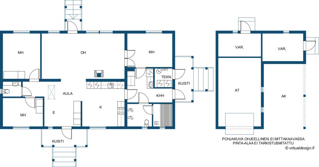 Tässä on 106-neliöisen talon pohja, tässä saisi khh:n yhteyteen enempi eteistilaa, jos tuota teknista tilaa ei tarvisi.