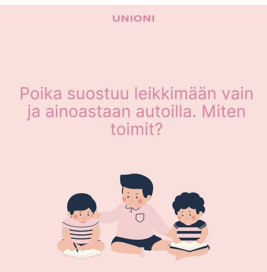 No tämä kolumni taitaa liittyä Naisasialiitto Unionin viime viikkoiseen somepostaukseen, jossa kysyttiin: "Poika suostuu leikkimään vain ja ainoastaan autoilla. Miten toimit?"