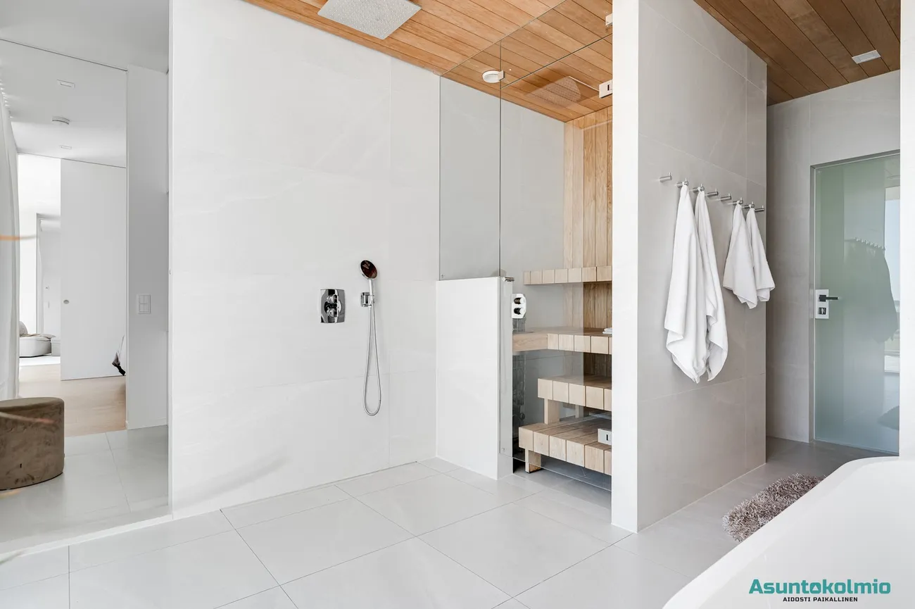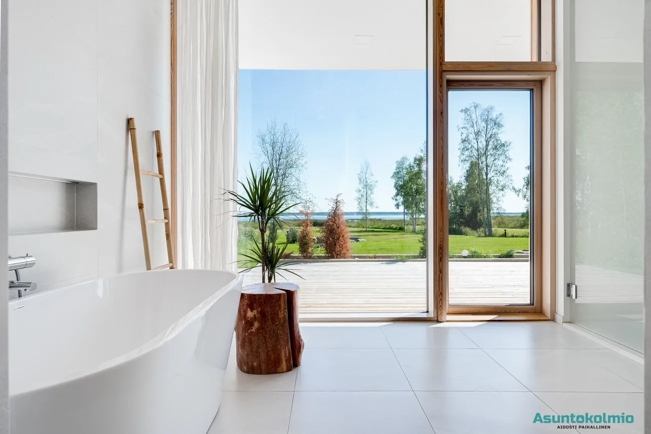 Mitä ootta mieltä tuosta kylpy- ja saunaosaston suojasuuesta. Ihanat näkymät, mutta valitettavasti myös sisälle näkymät ja viereiseen huoneeseenki. Tuo on sitä nykyaikaa, jolle en ite lämpene.