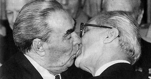 Neuvostoliiton johtajan Leonid Brezhnevin ja DDR:n Honeckerin suudelma.
