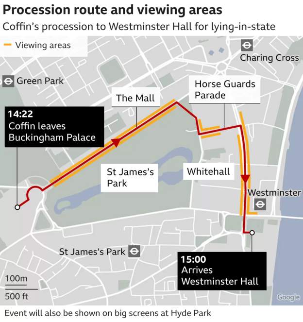 BBCn mukaan kuningatar Elizabethin arkun saattuessa Buckinghamin Palatsista Westminster Halliin kÀvelevÀt tÀnÀÀn: