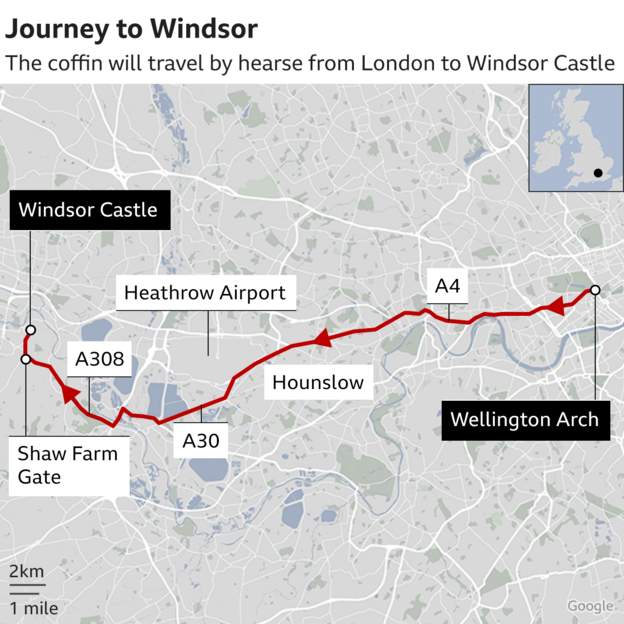 Kuningattaren hautajaissaattueen autolla suoritettava osuus Lontoosta Windsoriin on julkaistu. Buckinghamin Palatsi sanoo, että reitti on "suunniteltu pitäen yleisö mielessä".