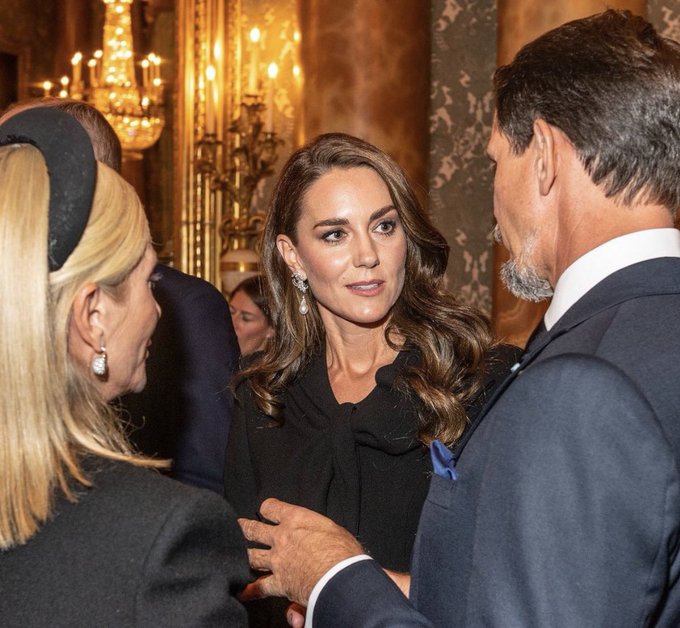 Catherine keskustelemassa Kreikan kruununprinssi Pavloksen ja kruununprinsessa Marie-Chantalin kanssa