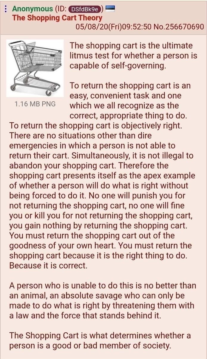 Ihminen joka jättää ruokakaupan kärryn lojumaan keskelle parkkipaikkaa vaikka palautuspisteitä riittää on yhteiskuntakelvoton. Ihminen joka sen vaivautuu viemään paikkaan jossa sen kuuluu olla on oikealla asialla.