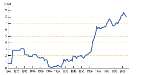 Tuolta kun katsoo niin ei ole 70-luvusta edes kaksinkertaistustunut. Juuri 70-luvun kynnyksellä sen sijaan suorastaan räjähti, kun keskiolut tuli 1969 ruokakauppoihin. Saatavuusongelmiakaan ei siis enää 70-luvulla ollut.