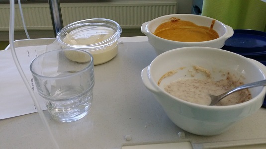 Tiedän joidenkin palstalaisten ärsyyntyvän, jos linkkaan jotai blogiini. No nyt linkkaan kuitenkin tämän kuvan. Sain tuon aterian 2 tuntia heräämöstä osastolle päästyäni joulukuussa 2019. Tuosta taustalla olevasta oranssista en edes pysty sanomaan, mitä se oli. Maistui lähinnä jauhetun buranan, vehnäjauhon, veden ja suolan sekoitukselta. Etualalla oleva - ilmeisesti ohrapuuro?? - oli täysin mauton. Muovikannen alla olevaa en edes maistanut vaan kivusta ähkäisten nousin sängystä, otin lompakon taskuuni, tippatelineen käteen ja lähdin kävelemään sairaalan toisessa päässä olevaan kahvioon.