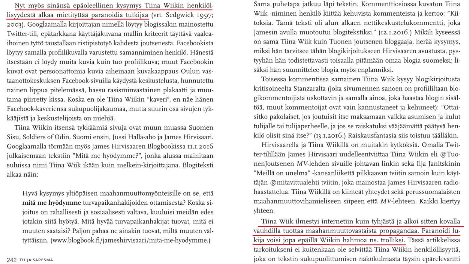 En puhuisi muiden vilpistä viitaten samalla Saresmaan, joka kirjoitti tieteellisen artikkelin siitä, ettei Tiina Wiikiä ole olemassa vuosia ennen kuin tämä kuoli.