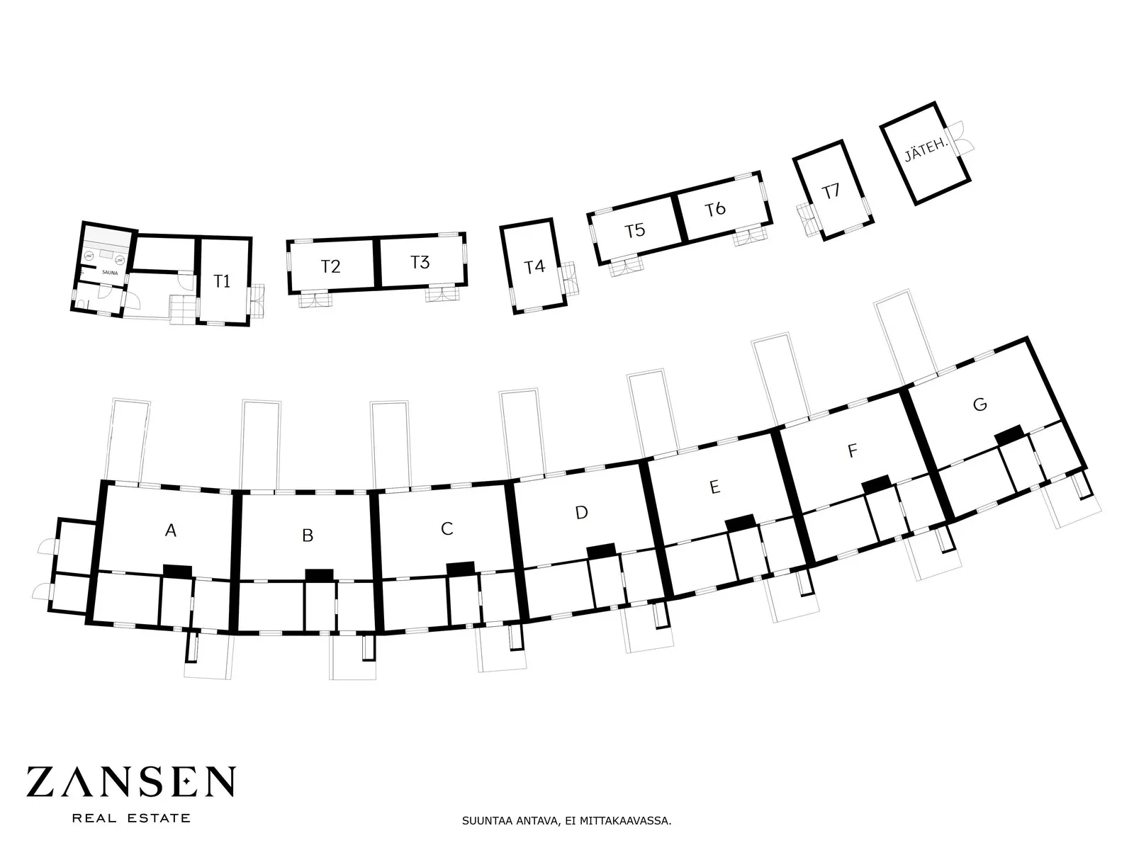 Tuo on se sauna ja 1. talon piharakennus. Ainakin piirustuksissa ne muut on ihan rivissä ja ovet samaan suuntaan. Sitä en tiedä miksi toi sauna on noin päin.