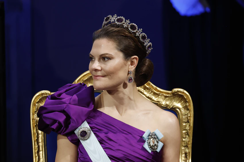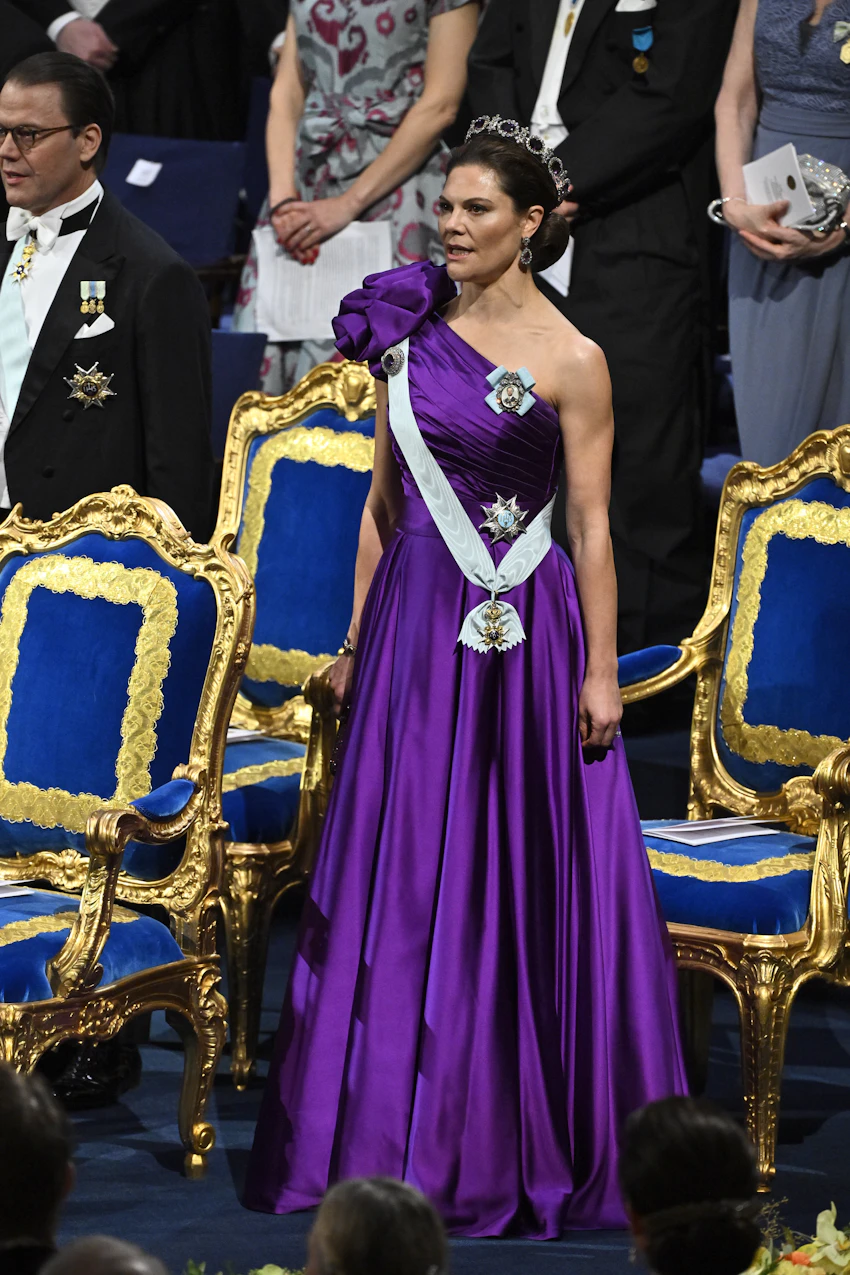 Ja nuo ametistikorut sopivat Victorialle ja tuohon pukuun erityisen hyvin. Victorialla on ametistikokoelmaan kuuluvat tiara, korvakorut, iso rintaneula kunniamerkkinauhassa, rannerengas sekä kampauksessa vielä pieni ametistirintaneula -  tykkään erityisesti siitä, että Victorialla on tiaran lisäksi Nobel-juhlissa yleensä aina kampauksessaan myös koru, niin nytkin.