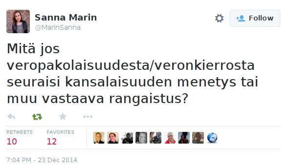 Marin nauraa hölmöille faneilleen ja äänestäjilleen matkalla pankkiin.