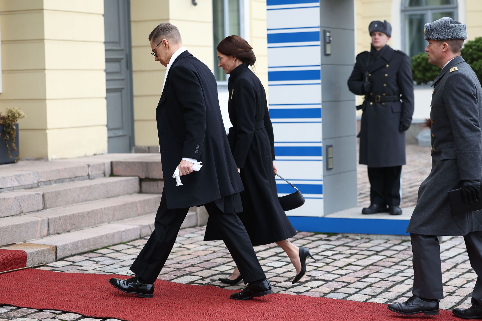 Koska Presidentinlinnassa presidentti Niinistö ja puolisonsa hyvästelevät hallituksen ja suurlähettiläät jne. Pääministeri Orpo puhuu sekä Niinistölle että Stubbille. Tasavallan presidentti Alexander Stubb ja