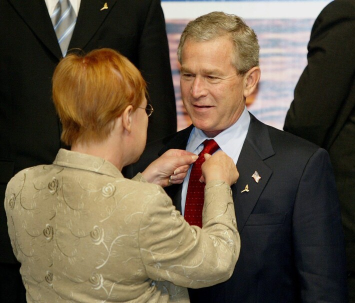 Niinistöllä oli aina tuo vaara puhuessa ja Halosella joka meni jopa oikomaan USA:n presidentin kravattia kesken ohjelman! Seurauksena maan armeija poltti Suomen lipun, se o