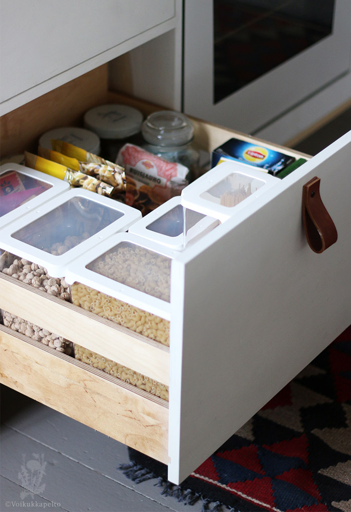 Minä laittaisin tuollaiseen kuiva-aineet (muroja ja puurohiutaleita lukuunottamatta), meidän harvat kodinkoneet joita ei ihan joka päivä käytetä (riisinkeitin, tehosekoitin, sauvasekoitin, vatkain) sekä kakkukuvut sun muut. Valon asentaisin kyllä, nykyään ledinauhat on niin helppoja ja suhteellisen edullisia.
