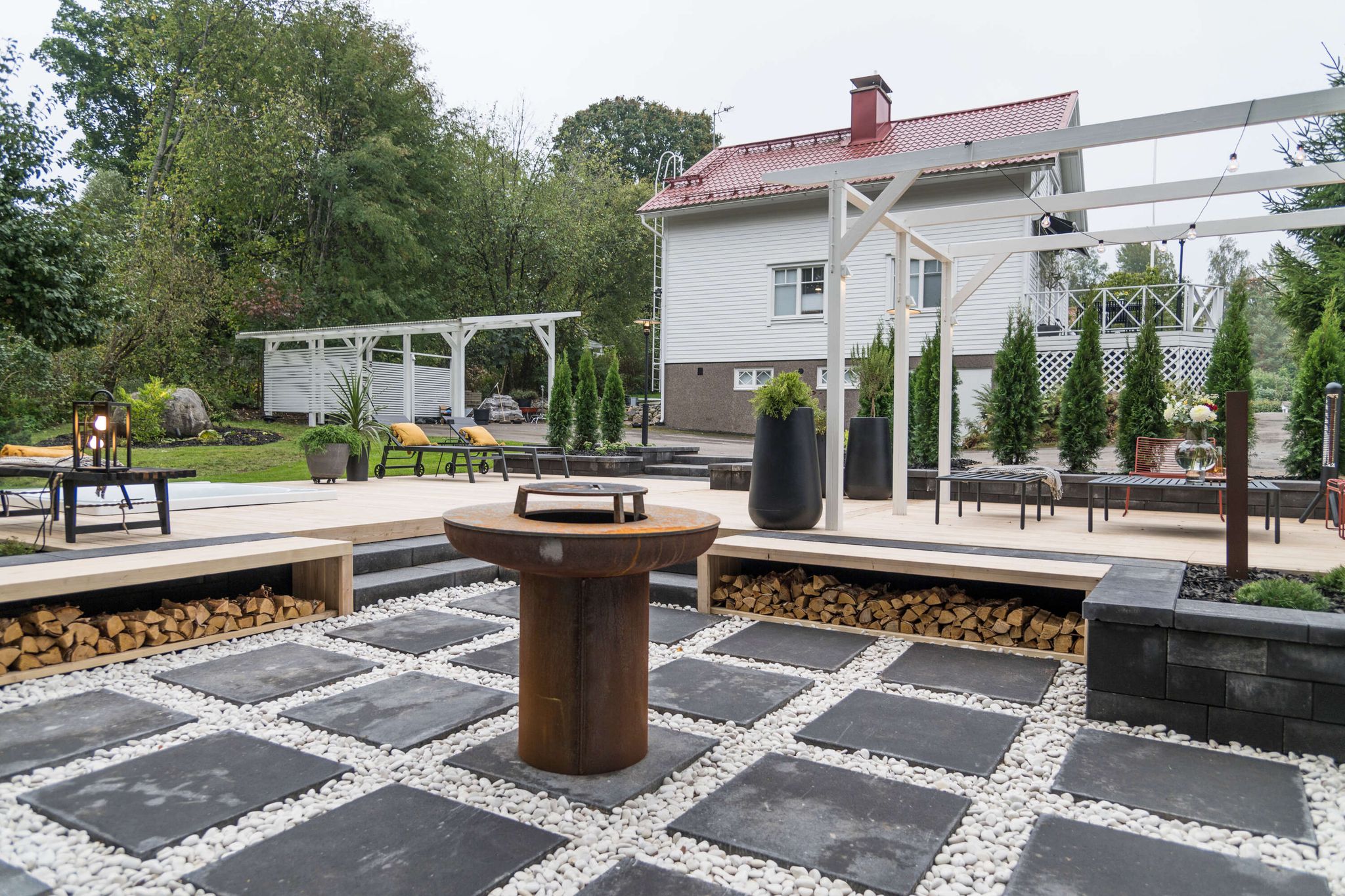 Tykkäsin Seijan ja Tomin pihan remontista, erityisesti siitä tulipaikan suunnittelusta. Ne penkit olivat upeat ja niiden alle sai siististi ja kätevästi puut varastoon. Pihasta tuli helppohoitoinen ja puiden ja pensaiden ympäristöt näyttävät nyt siisteiltä eivätkä kerää rikkaruohoja. Ja koska Seija tykkää kulkea pihalla paljain jaloin, isot terassit ovat kätevät (nyt kun niistä ei tule tikkuja jalanpohjaan).