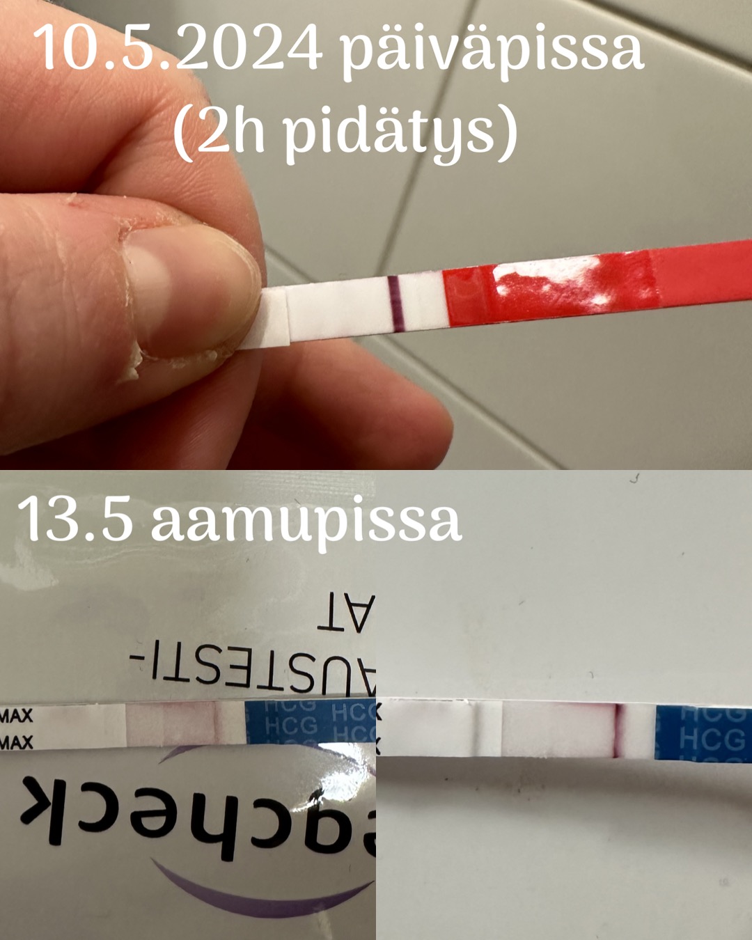 tein 10.5 töiden jälkeen rfsu raskaustestin johon tuli todella haalea mutta silmin nähtävä viiva kuivuessaan kuitenkin katosi. Olin lukenut paljon huonoja kokemuksia kyseisestä testistä joten päätin odottaa pari päivää ja tänään maanantai 13.5 tein aamupissasta uuden testin (pregcheck) johon tuli taas haamu viiva, kumpikaan testeistä ei ollut varhais testejä. Mietin voiko olla sattumaa vai voisiko olla että vihdoin 9kk yrityksen jälkeen olisi tärpännyt? Kerro omia kokemuksia! Kertokaa onko nämä teidän mielestä haamuja vai vaan viivanpaikkoja? Kuukautiset pitäisi alkaa keskiviikkona