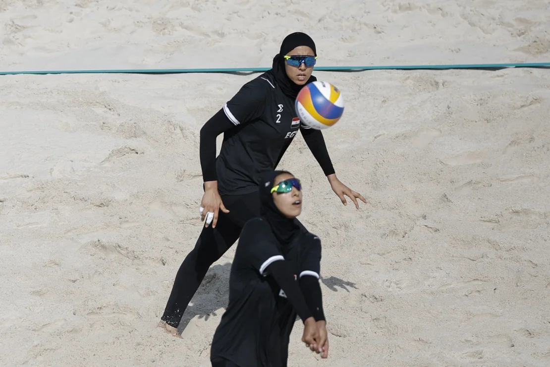 Egyptin rantalentopallonaisilla oli pitkät ihonmyötäiset housut ja pitkähihainen ihonmyötäinen paita. Päällä oli löysähkö T-paita. Lisäksi heillä oli huivit päässä.